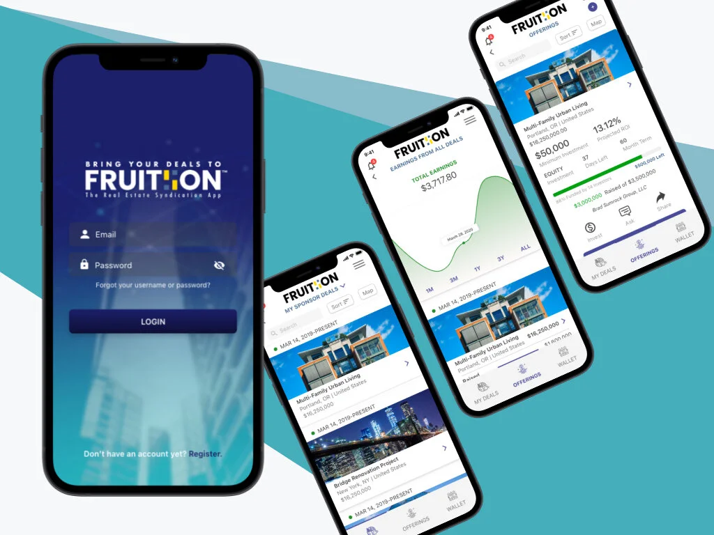 Fruitiion is an SEC-accredited real estate syndication mobile app, which organizes the capital of investors and sponsors, manages ownerships fees, and automates distributions in one application. It aims to have a simple and minimalistic design with an emphasis on usability and functionality to gain the trust of individuals with high capital holdings.